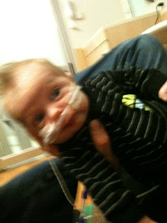 Jaclyn and my Dad came up for Wednesday night dinner. Unfortunately getting stuck in the waiting room for too long as the message that they were here was never relayed to us. Which we were sleeping in here anyway. They brought us a gym mat so we could play with Frankie Fuse on the ground. We in turn fell asleep on it. We got away with sleeping with our baby because his alarms would go off if we rolled over on him. We were only woken by surgery coming up and taking a look at the omphalocele. We had concern about a blister like area. The omphalocele has what appears to be islands of skin growing on it. They think the blister is just fluid trapped between the new skin and the old umbilical membrane. That is great if all this skin is growing up on it.