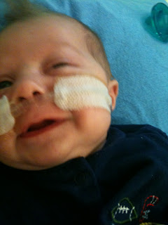 Not really anything new or changed here. Alex came up long before me. My Dad had arrived at the same time and they hung out together. Apparently Frankie Frock was up since prior to Alex arriving at 2:00. From the pictures I have seen, he was wide eyed and happy as can be. I arrived around 5:00, as I was working today. When we ate dinner around 7:00 he finally started to crash and has been out cold since. So asleep that he got his last feeding through his feeding tube so we wouldn't wake him. Now if Frankie Flip-Flops was at home and wanted to sleep through the night, we surely wouldn't wake him for a feeding as long as he was gaining weight, but here they have a rules. He must be fed every 3 hours. Alex tried to switch his bottles brands earlier from the hospital provided Dr. Browns to Born Free brand and Frankie Felt wanted nothing to do with it. That was about all the excitement for the day. The surgeons came by and rewrapped Frankie Flats before we got here, so we never saw the omphalocele today. We are confident it is still there though.